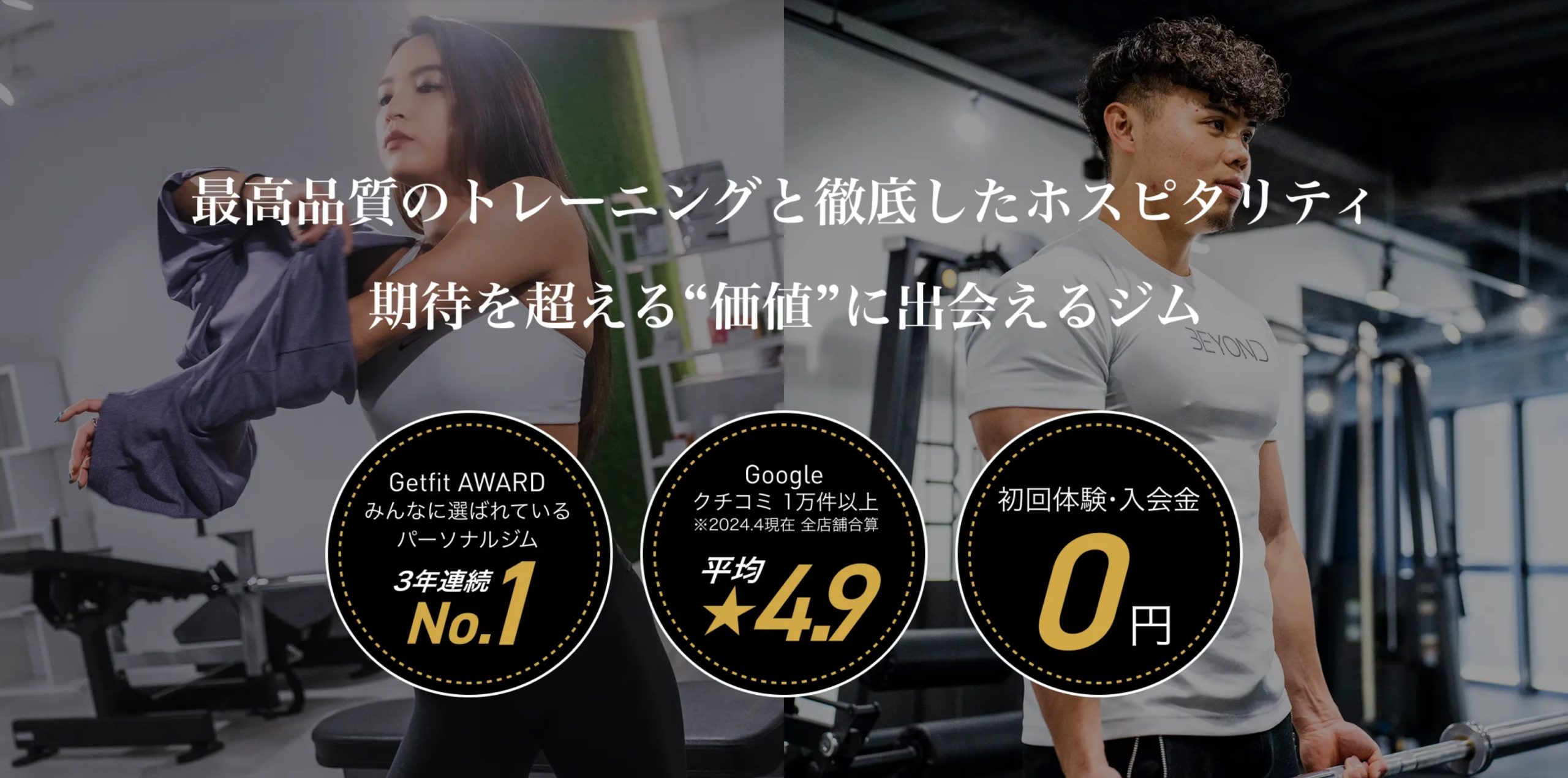 BEYONDは全国120店舗以上を展開する、BEST GYM AWARD受賞のパーソナルジム。美ボディコンテストでの入賞者や資格をもつ、プロのパーソナルトレーナーのみが揃っております。