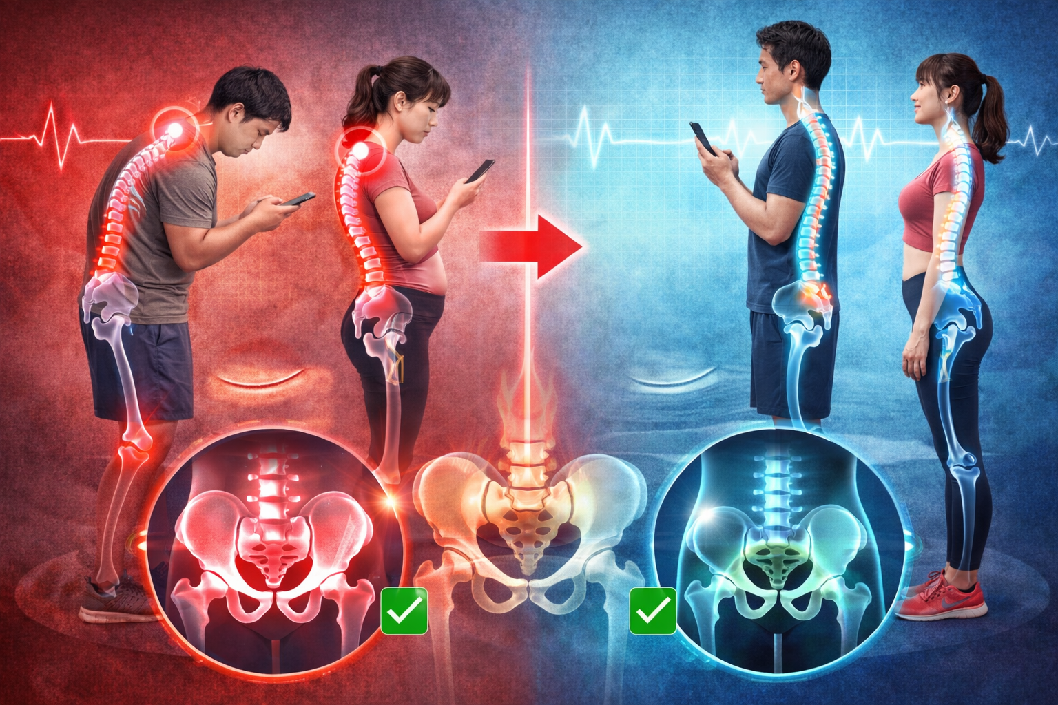 **スマホ首・反り腰・猫背の本当の原因は「胸椎が動かないこと」と「股関節が使えていないこと」**です。